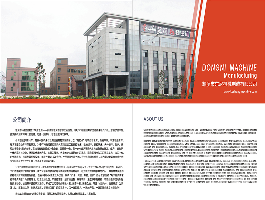 公司位于浙江省慈溪市东部工业园区,创建于1991年,赶在中国机床行业高速发展的浪潮,多年来不断购入高精度加工中心、龙门铣、导轨磨等设备120余台套,是一家从事自动车床、数控车床、攻丝机、气液程控车床、轴承套圈自动车床等研究、开发、生产、销售于一体的高科技企业。 公司占地面积20000平方米,建筑面积15000余平方米,标准化生产车间6个,年生产量10000余台,产品销往全国各地,经过多年潜心经营,成为周边地区享有盛名的机床研发及生产厂家,并逐步走向国际市场。公司以诚信为本,创新精品为宗旨,力争以优秀的技术、产品、服务竭诚与您合作! ...